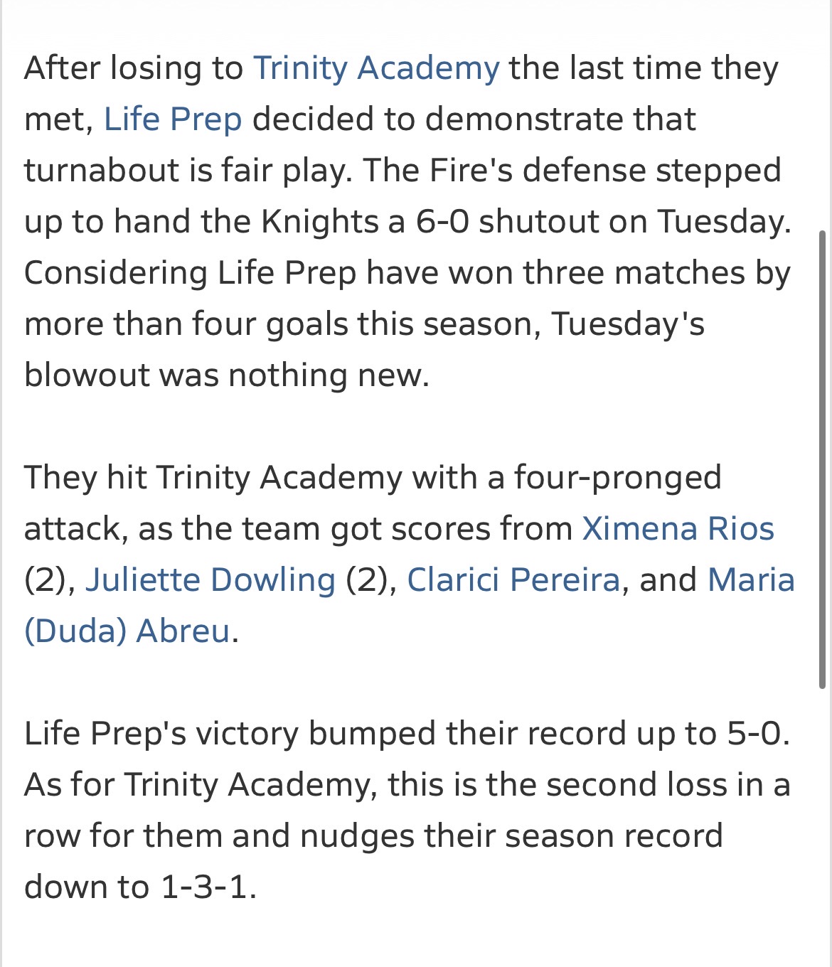 Win against Trinity Christian Academy – 2 goals
